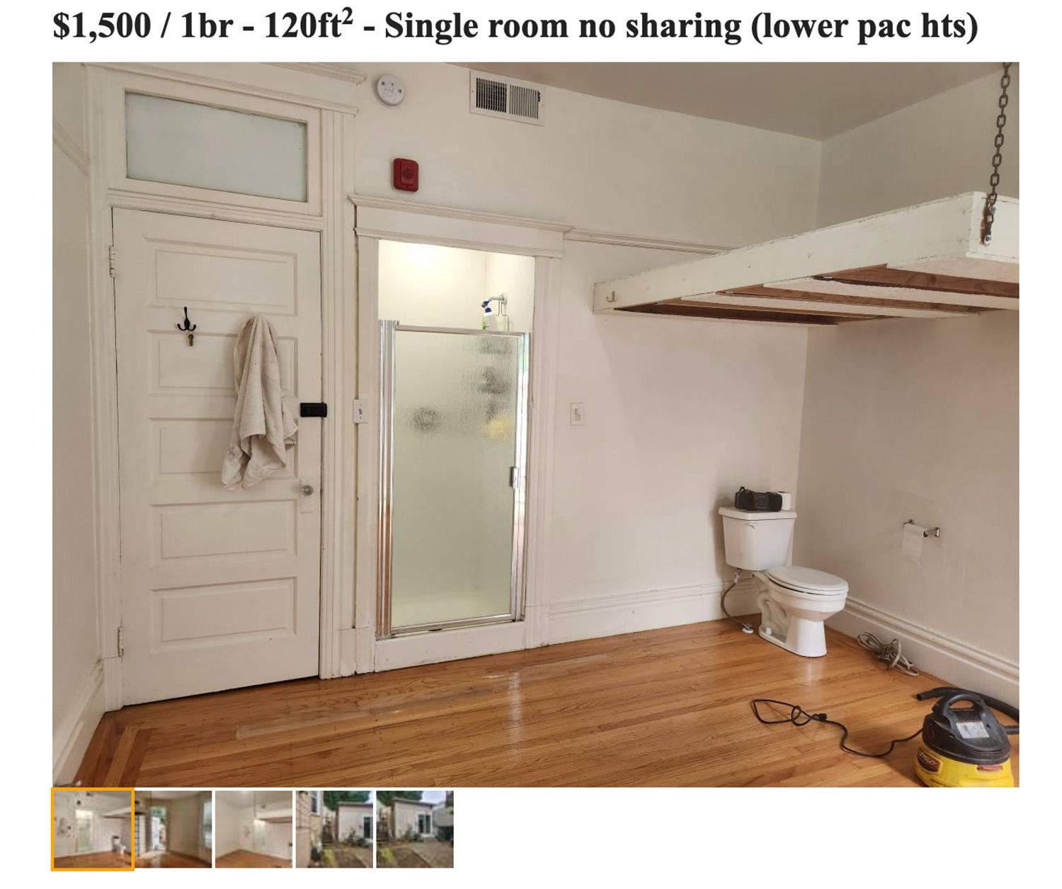I located the listing, which is real and was posted four days ago. This grand, 120-square-foot single bedroom/bathroom combo in Lower Pacific Heights comes with the tagline "no sharing," which clearly refers to the bathroom amenities themselves.