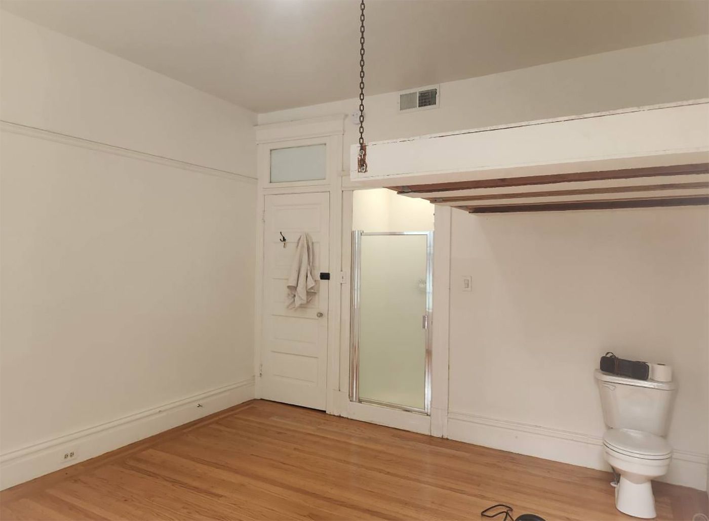 Is it a bedroom with a bathroom bleeding into it, or a bathroom with a loft bed in it? You decide! You can easily imagine that both the steam from the shower and the scents created during the toilet's use will both just be part of the charm of living here, and that tiny vent up near the ceiling will not make any difference.