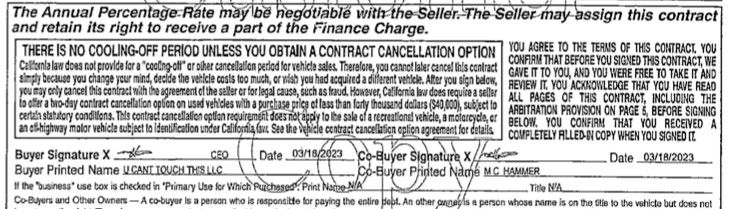 Maybe they do! The contract for the car is listed as one of the exhibits in the lawsuit, and while his signature is not legible, but the “Printed Name” field in the contract does indeed say “MC Hammer.”