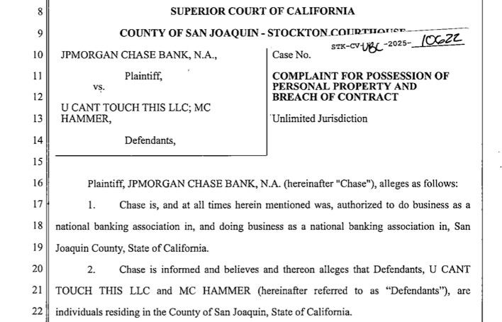 And Chase Bank says it's Hammertime on collecting their payment. “As of July 16, 2025, the unpaid provincial balance of $76,732.79 is due and payable to Chase,” their lawsuit says. “Chase has demanded possession of the Vehicle from Defendants. Defendants have not surrendered the vehicle.”