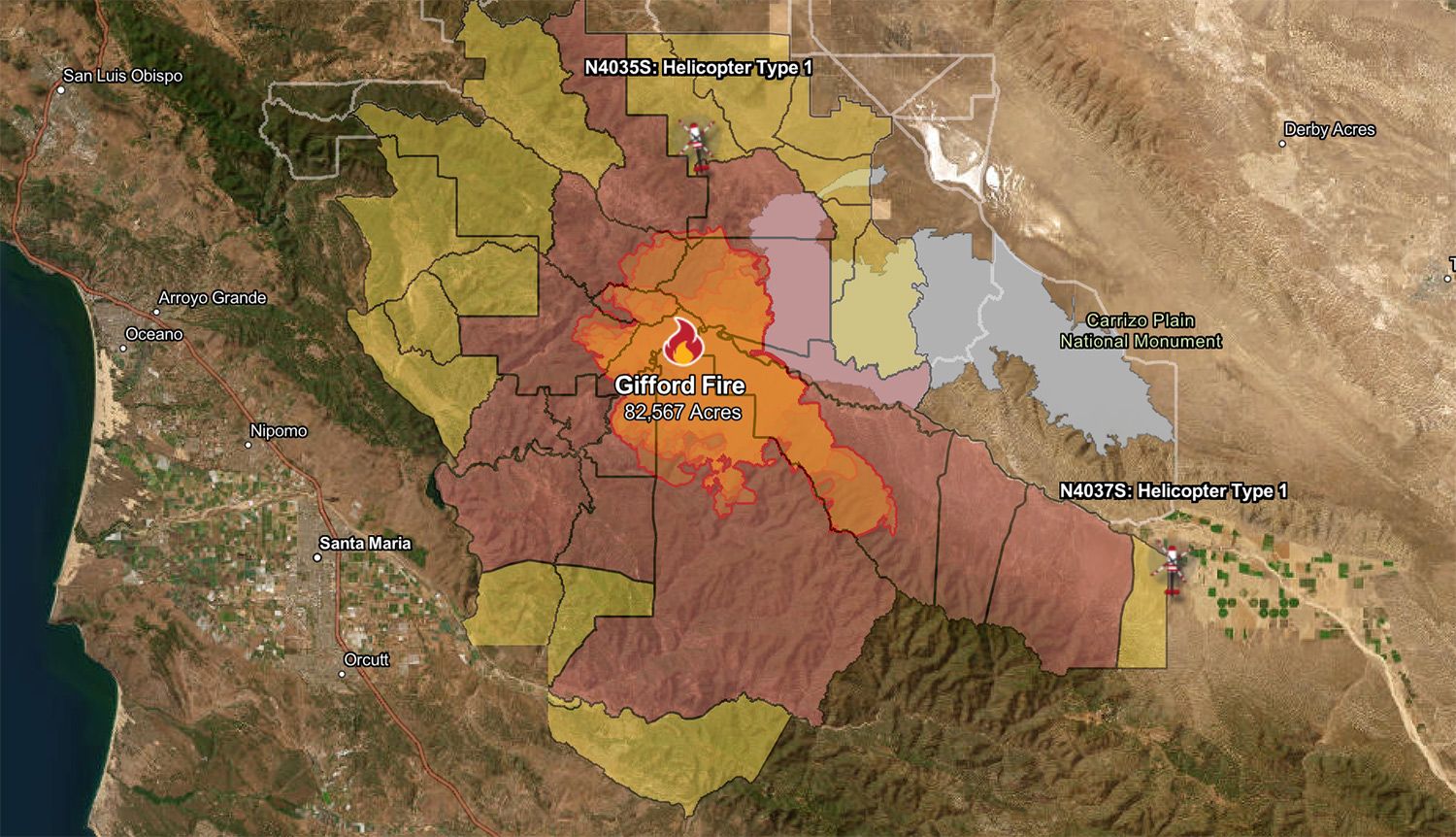 The Gifford Fire, which was sparked on Friday in the Los Padres National Forest — near the burn scar from the recent Madre Fire — has grown to 82,567 acres of Tuesday morning, and weather conditions suggest it will only grow larger in the coming days.