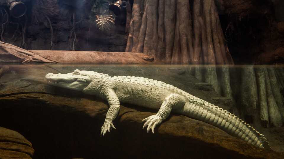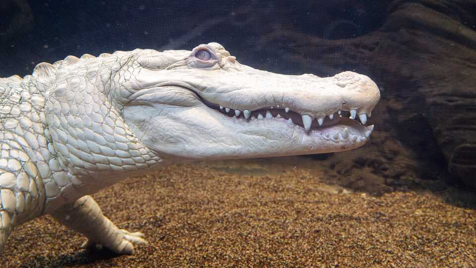 The famed albino alligator Claude was hatched 30 years ago, and not at his current home in a synthetic moat at the California Academy of Sciences, but in the swamplands of Florida. He was taken in by an alligator rescue, because his albino condition and poor eyesight meant he would surely not last long in the wild. He came to the Academy of Sciences in 2008, originally homed with a non-albino female alligator named Bonnie. But she bit off one of Claude’s fingers (I suppose you could say she was the insti-gator), and the two were separated.