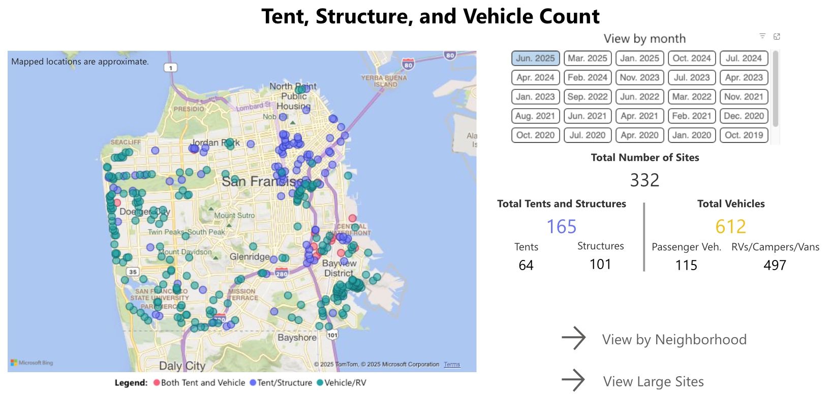 The city knows where all these RVs are, and they count them every three months or so (they are the green dots on the map above). The latest June count showed 612 vehicles with people living in them, and that’s up from 549 in March. So technically, the number of people living in vehicles has increased slightly under the Lurie administration. But that’s before this initiative has launched, and before Lurie starts offering people cash to get rid of their RVs.
