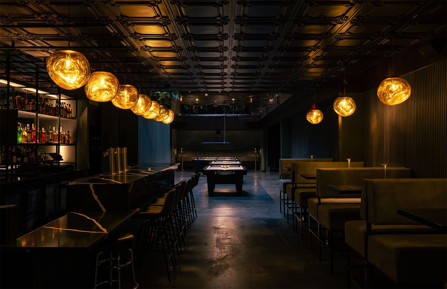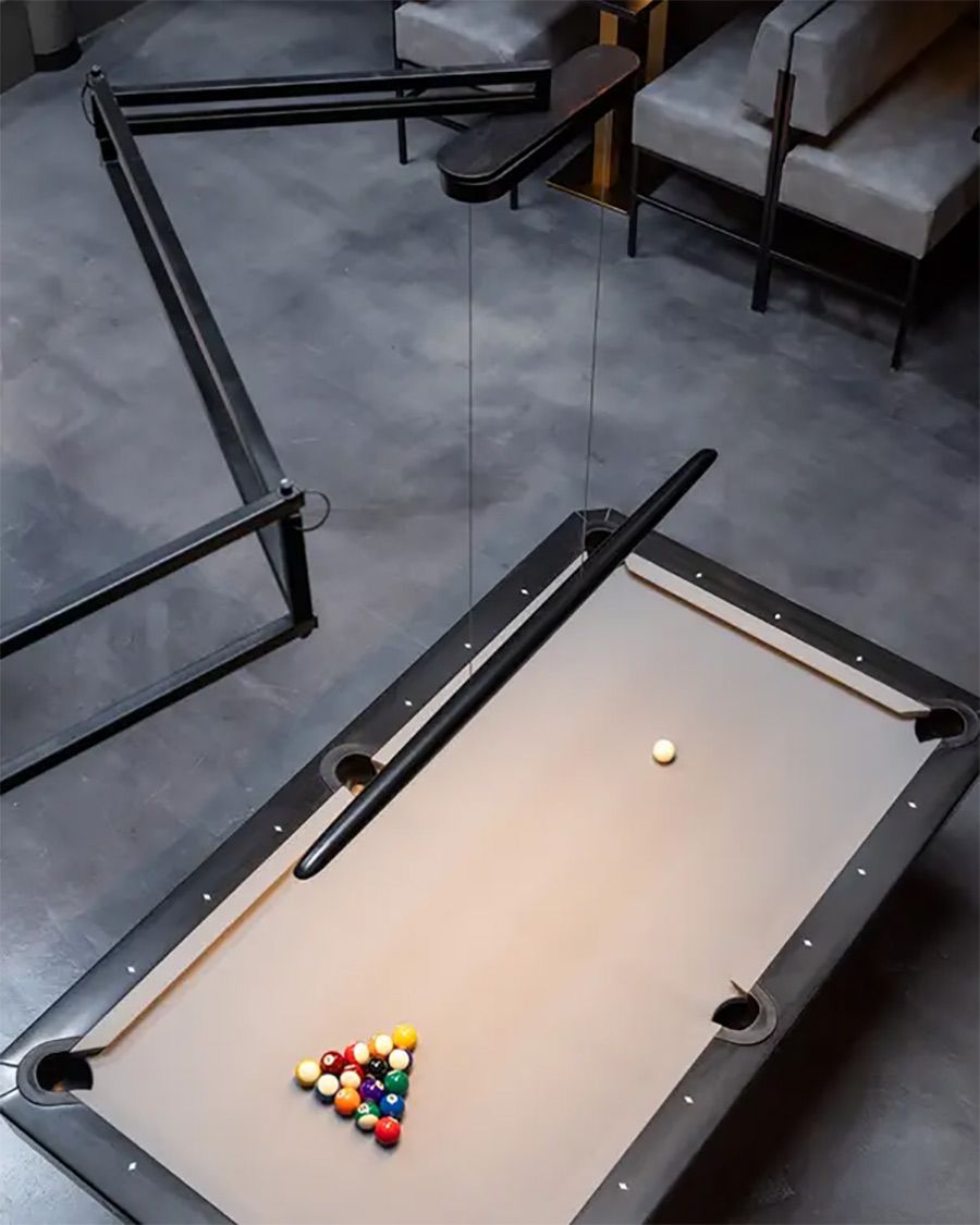 Each pool table is accompanied by floating, focused lighting, keeping the light where it needs to be and keeping the mood lighting dimmer in the lounge space.