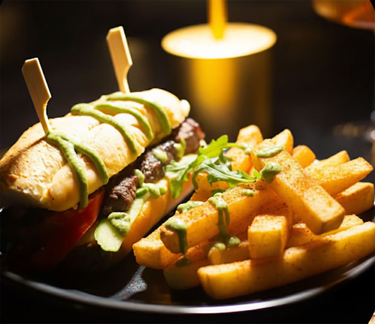 The venue offers a menu of signature cocktails and globally inspired street-food bites, with Brazilian cheese bread bites (pao de queijo), tandoori chicken kabobs, and corn-edamame fritters among the options. There is also a sandwich from the Brazilian street food tradition, the paozinho Brasilia, that features a grilled Brazilian steak skewer served on French bread with melted provolone cheese, cucumber, tomatoes, arugula, and spicy cilantro-garlic crema.