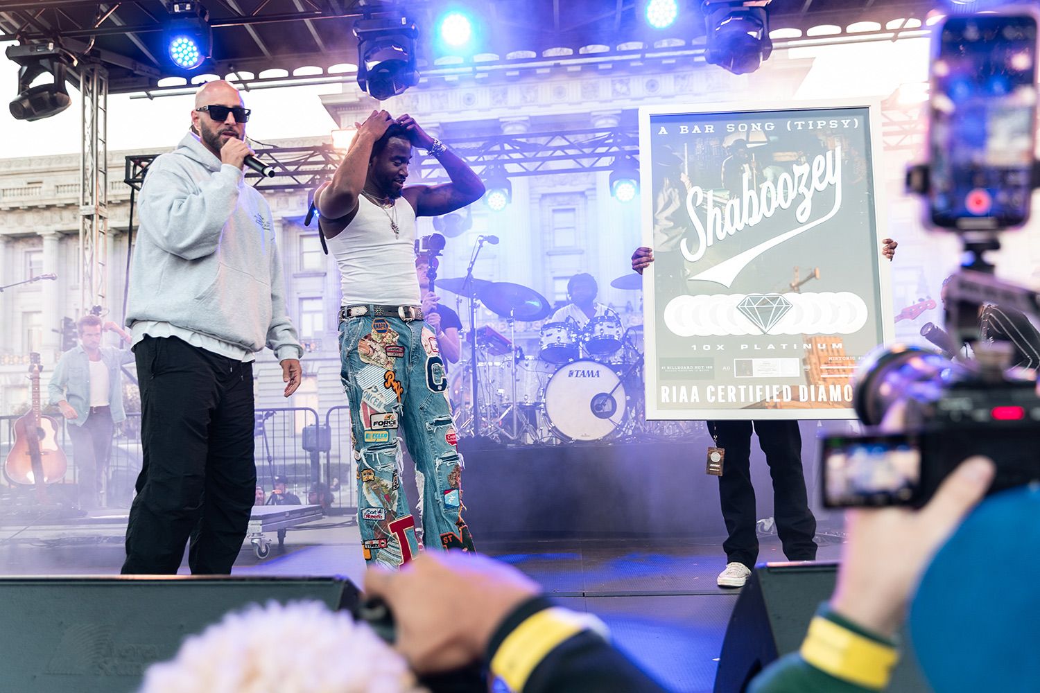 As Shaboozey's set was winding down, Empire founder Ghazi Shami presented the singer with a certified diamond record plaque, marking ten million units sold for "A Bar Song (Tipsy)". The song spent 19 non-consecutive weeks at the top of the Billboard Hot 100, tying a record set five years ago by Lil Nas X's "Old Town Road," and it has over 1.4 billion streams on Spotify. (FYI, these days, Billboard and the Recording Industry Association of America [RIAA] use "album equivalent units" in addition to actual album sales to calculate units sold, and every 1500 song streams equals one unit sold.)