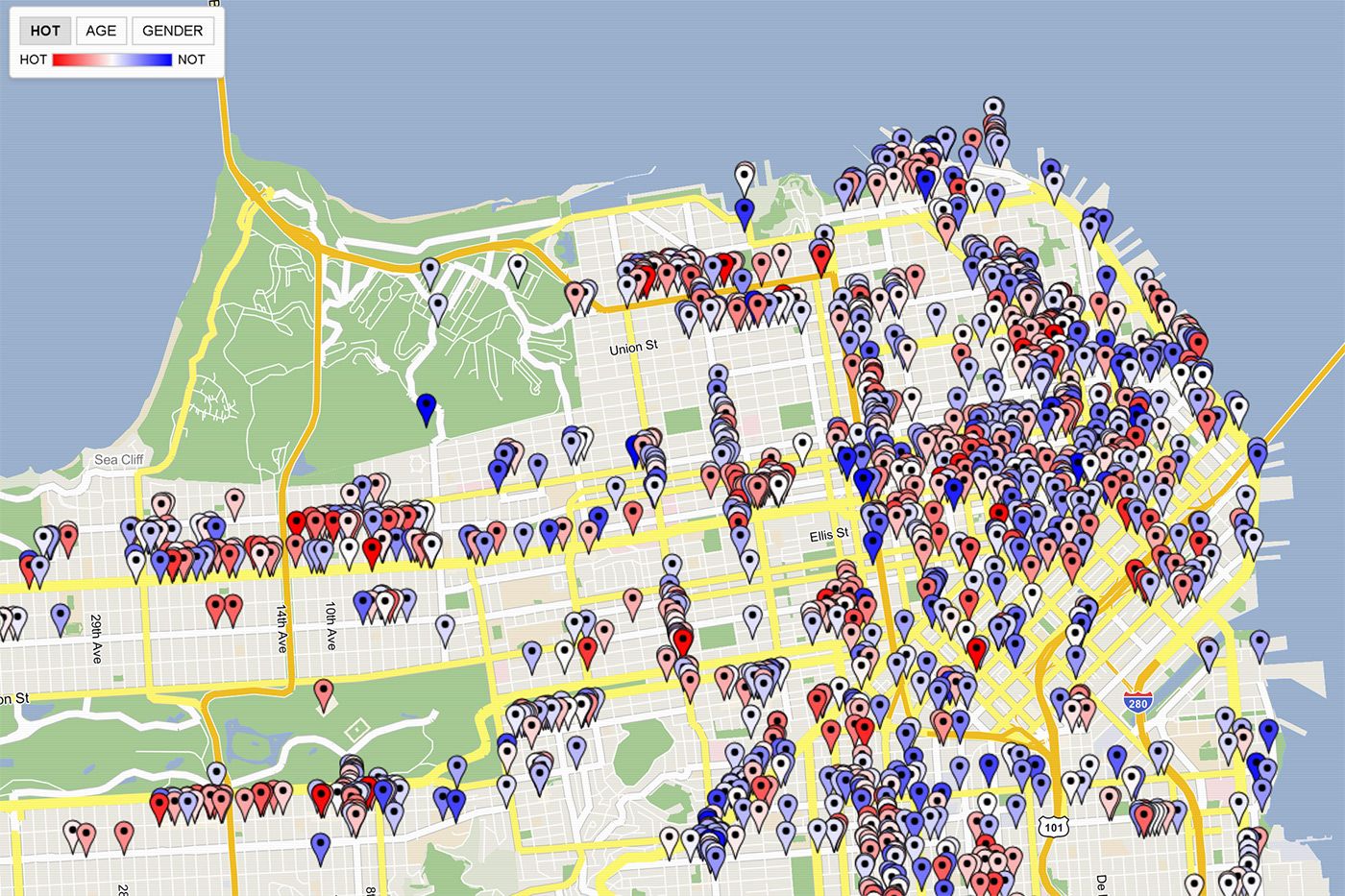 "I scraped millions of Google Maps restaurant reviews, and gave each reviewer's profile picture to an AI model that rates how hot they are out of 10," says San Francisco-based website creater Riley Walz. "This map shows how attractive each restaurant's clientele is. Red means hot, blue means not."