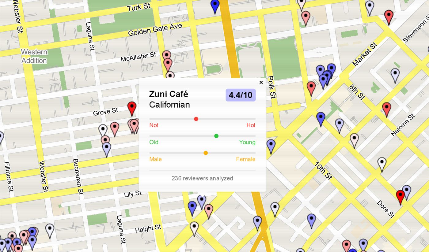 And the results are fairly strange! The top-rated restaurants based on customers' attractiveness are some random hot-pot spots — Fondue Chinoise and Hot Pot Champ, both in Chinatown/North Beach — as well as Ararat Kebab & Gyros on O'Farell Street in the Tenderloin, the Google reviews of which can be seen here.