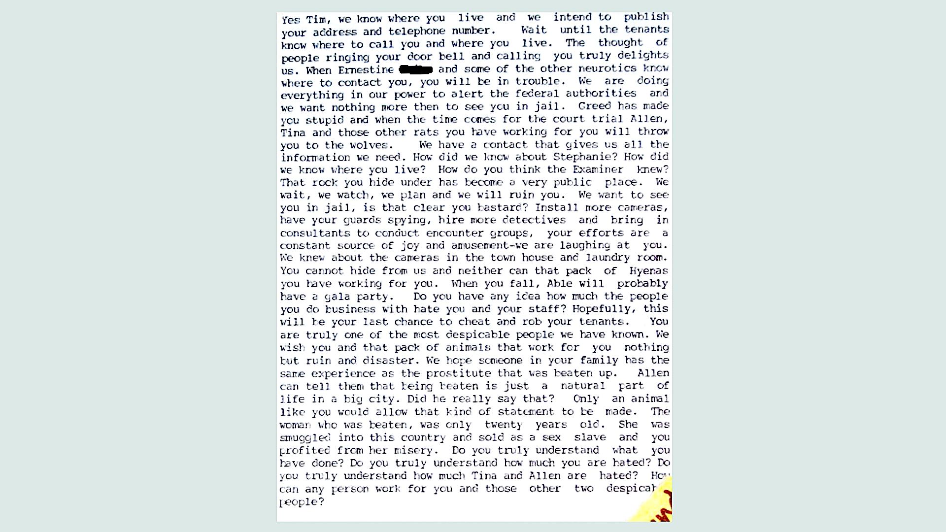 Yes, Tim, we know where you live, and we intend to publish your address and telephone number. Wait until the tenants know where to call you and where you live. The thought of people ringing your door bell truly delights us. When Ernestine [redacted] and some of the other neurotics know where to contact you, you will be in trouble. We are doing everything in our power to alert the federal authorities and we want nothing more than to see you in jail. Greed has made you stupid, and when the time comes for the court trial, Allen, Tina and those other rats working there will throw you to the wolves.