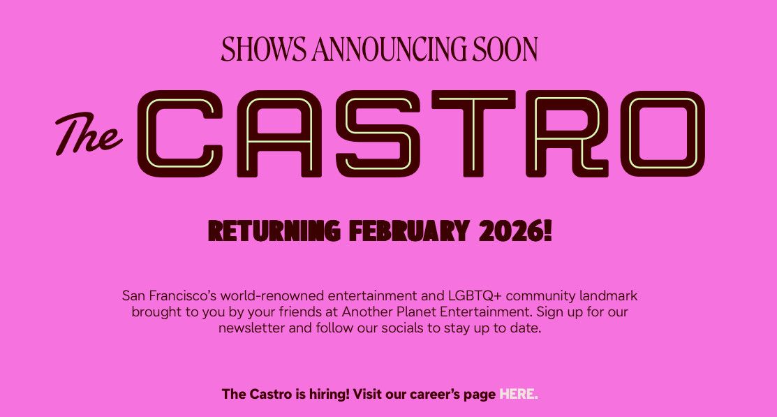 But what’s this? The Castro Theatre’s website now says “The Castro Returning February 2026.” And that appears to be the new branding of the venue, dropping "Theatre" from its name, to officially go by The Castro for APE booking purposes.
