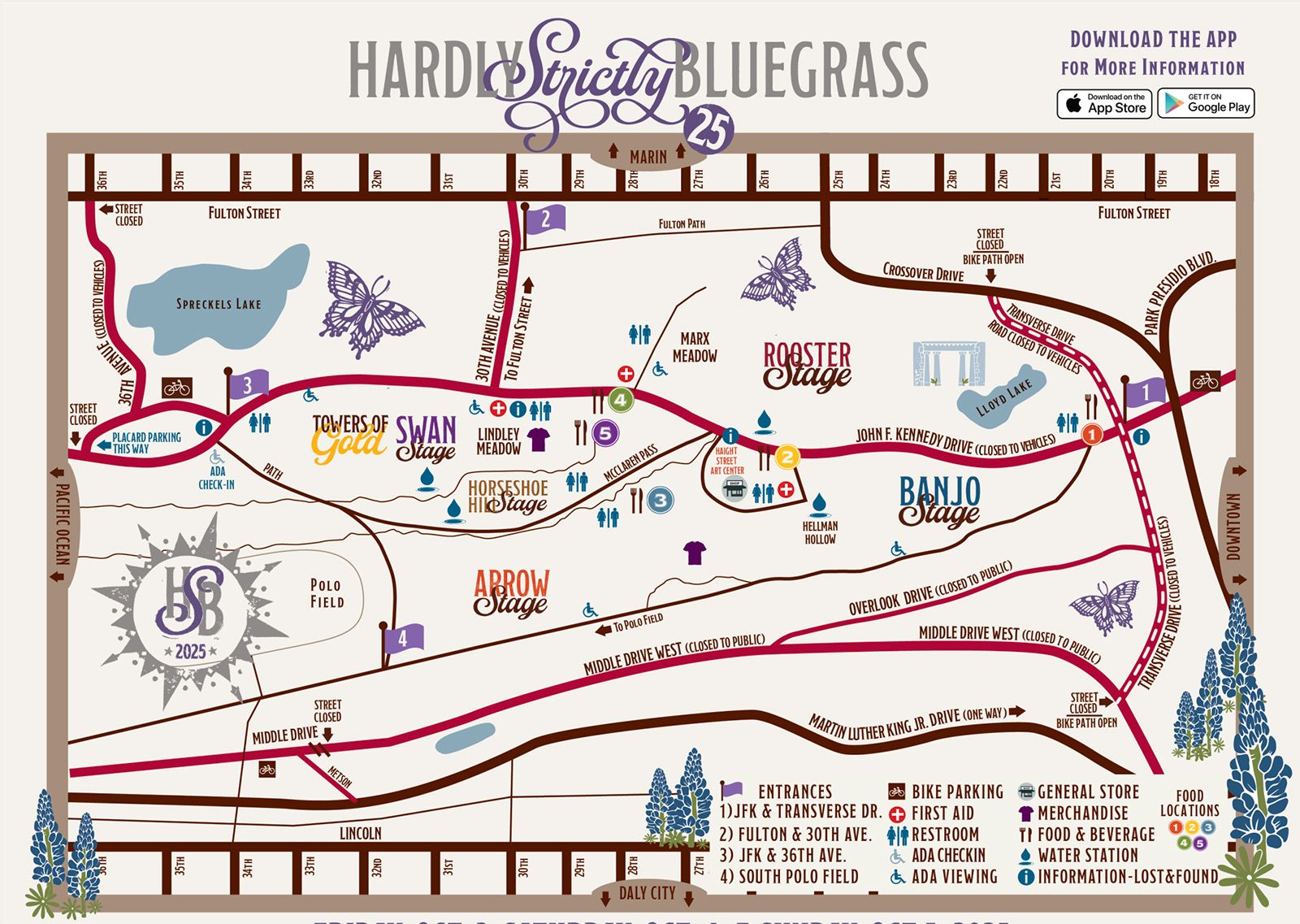The festival entrances on the Fulton (north) side of the park are in the same places as Outside Lands, at 30th Avenue, and at 36th Avenue (where OSL's VIP entrance is typically located). The entrance on the south side is at Middle Drive and Metson Road, near the south side of the Polo field, and a fourth entrance — the one furthest east/closest to downtown — is at JFK Drive and Transverse Drive.