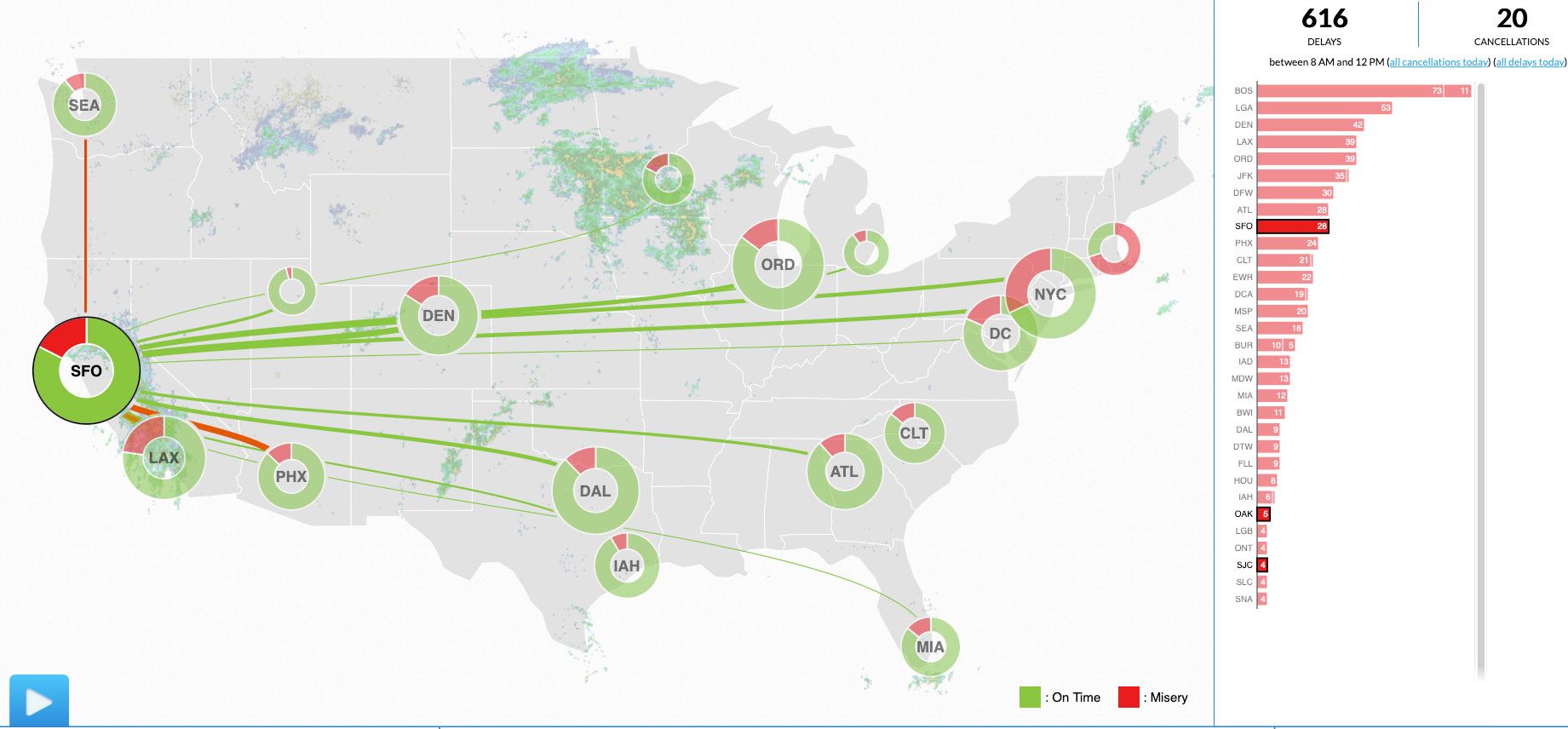 As of Tuesday morning, things have certainly improved. As of about 11 am Tuesday morning, FlightAware’s MiseryMap (great name, by the way) showed just 28 SFO flight delays, and one cancellation.