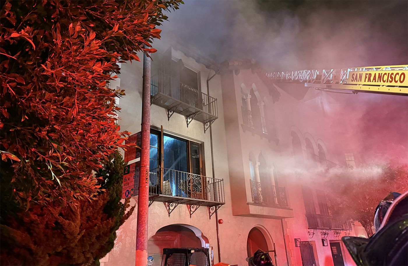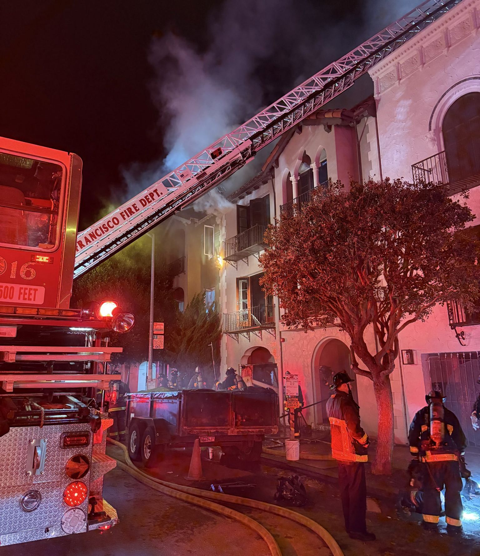 The firefight was ongoing as of 5:15 am, and the department reported that two firefighters were injured. The public was asked to avoid the area of Chestnut Street between Baker and Broderick streets.