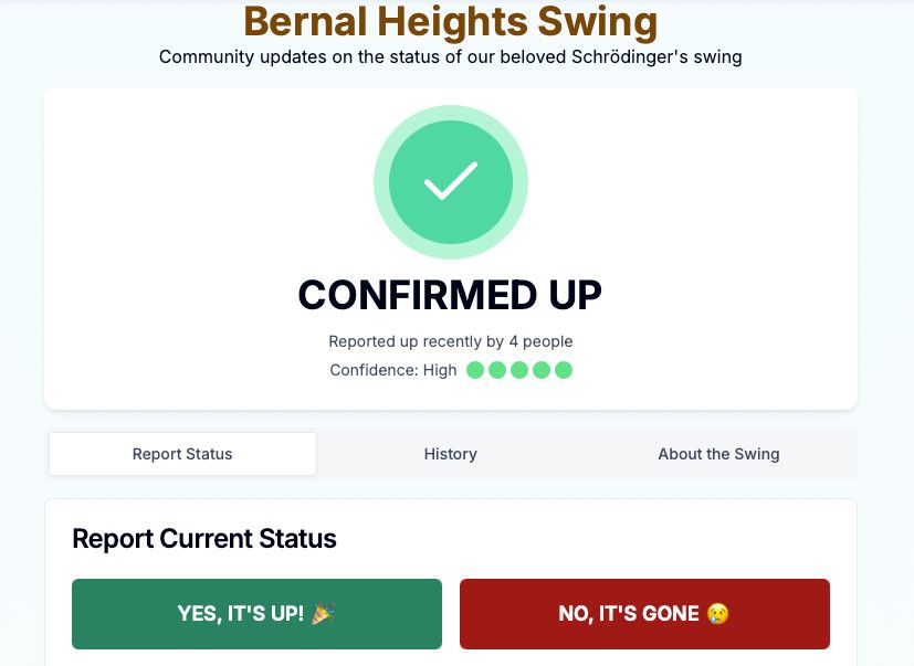 Though none of the legal playground swings has the notoriety or cult following of the Bernal Hill Swing. The Bernal Hill Swing even has its own real-time website telling you whether or not a swing is up at any given moment, based on constantly updated crowdsourced information.