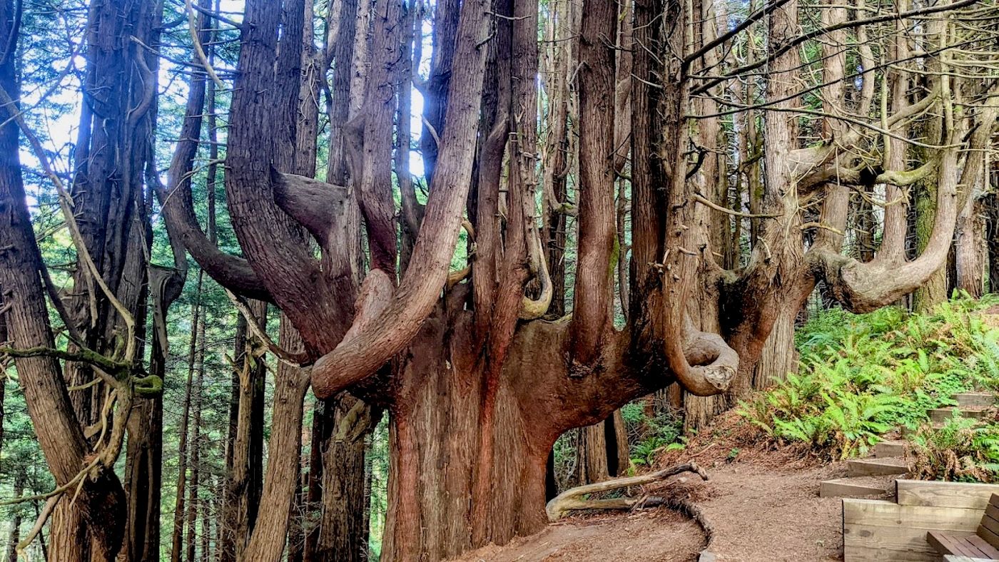 The Save the Redwoods League now protects them within Shady Dell, where the 2.3-mile Peter Douglas Trail leads through mist and silence to a viewing platform above their roots. Reaching the grove requires a four-wheel drive and a long, bumpy road — fitting for trees that never took the straight path either. — Secret San Francisco