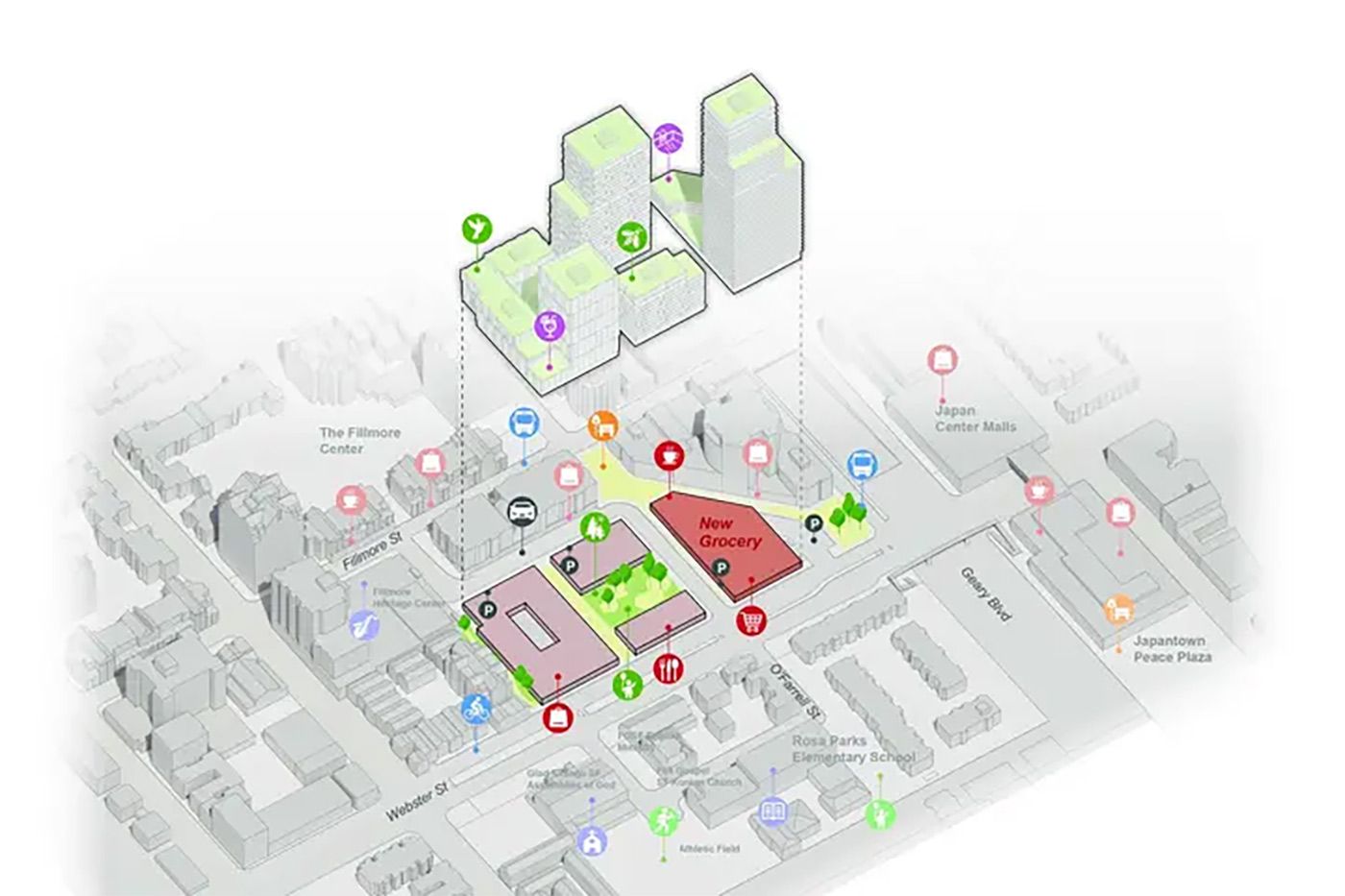 According to a statement from Align Real Estate, the proposed development would include a "diverse mix of unit types, income levels and uses" to create "an inclusive, mixed-income community that aligns with San Francisco’s broader housing goals." The plan includes green space in the center of the site, a restaurant facing Webster Street, 500 parking spaces in a parking structure, and approximately 270 below-market-rate units.