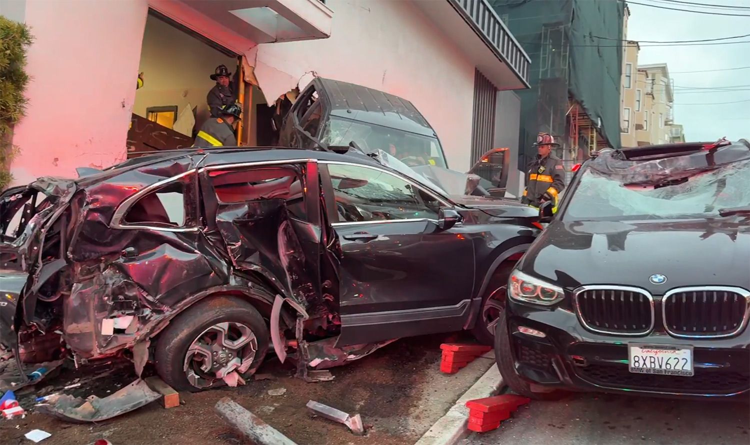 The crash happened around 6:20 am Tuesday, with the SF Fire Department posting from the scene at 7:31 am. The department reported that a "high speed motor vehicle accident" had occurred, and images from the scene show two of the vehicles ended up facing downhill on Broderick Street toward Lombard.