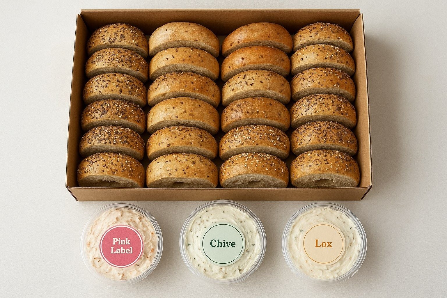 Below we see an image of Boichik Bagels that were offered on an SF-based catering website called Forkable. Boichik Bagels are celebrated as quite possibly the best in the whole Bay Area, so it’s not like this brand needs any embellishment. But very oddly, these bagels have the bottom fourth of the bagel cut away and discarded, in a way that I doubt that any human being has ever eaten a bagel, ever. Moreover, one of the shmears is labeled as “Pink Label,” which is an existing Boichik product, but one that looks nothing like what is depicted below.