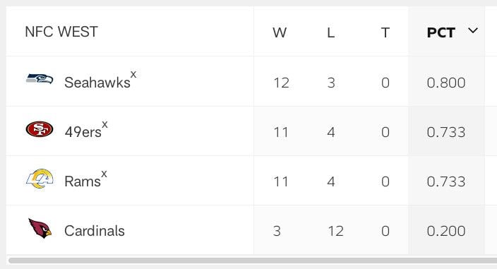 And an 11-4 record is good enough to squeak past the Rams right now in the NFC West divisional standings, but it is not good enough to overcome Seattle at 12-3. The 49ers can still win the division, but that means winning their last two games, including their January 4 matchup with those very Seattle Seahawks.