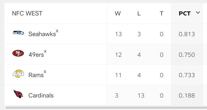 Looking at the NFC West standings, the Seattle Seahawks are still in first place. But we play those Seattle Seahawks this coming Saturday night, and if the 49ers win, they are the 2025 NFC West Champions.