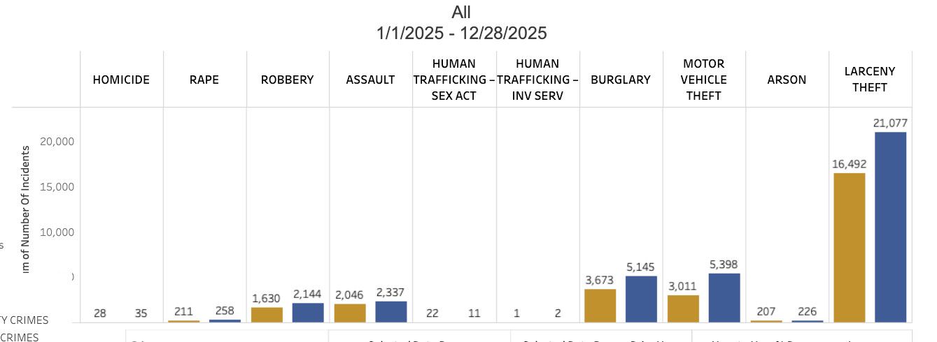 KRON4 gets its numbers straight from the SF Police Department, via their SF Crime Dashboard seen above. 2025 crime stats are represented by the brown-orange bars, last year’s 2024 crime stats are represented with the blue bars. And even though there are still a couple days left in 2025, this chart represents the same date range for both years (that is, January 1 through December 28).