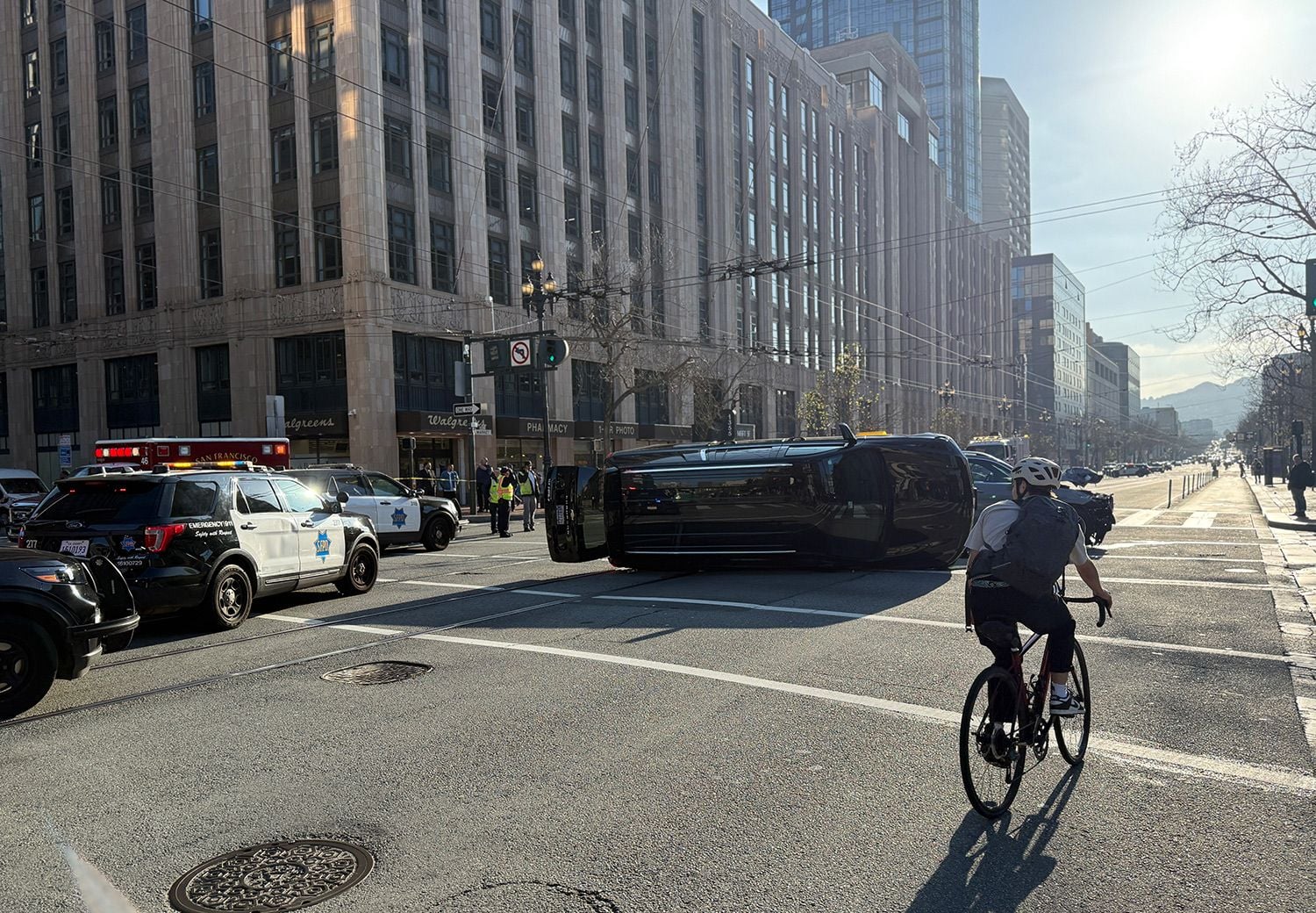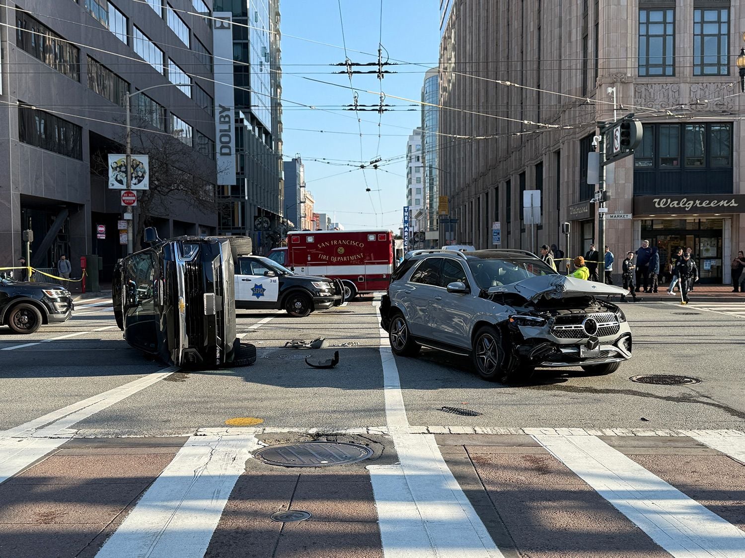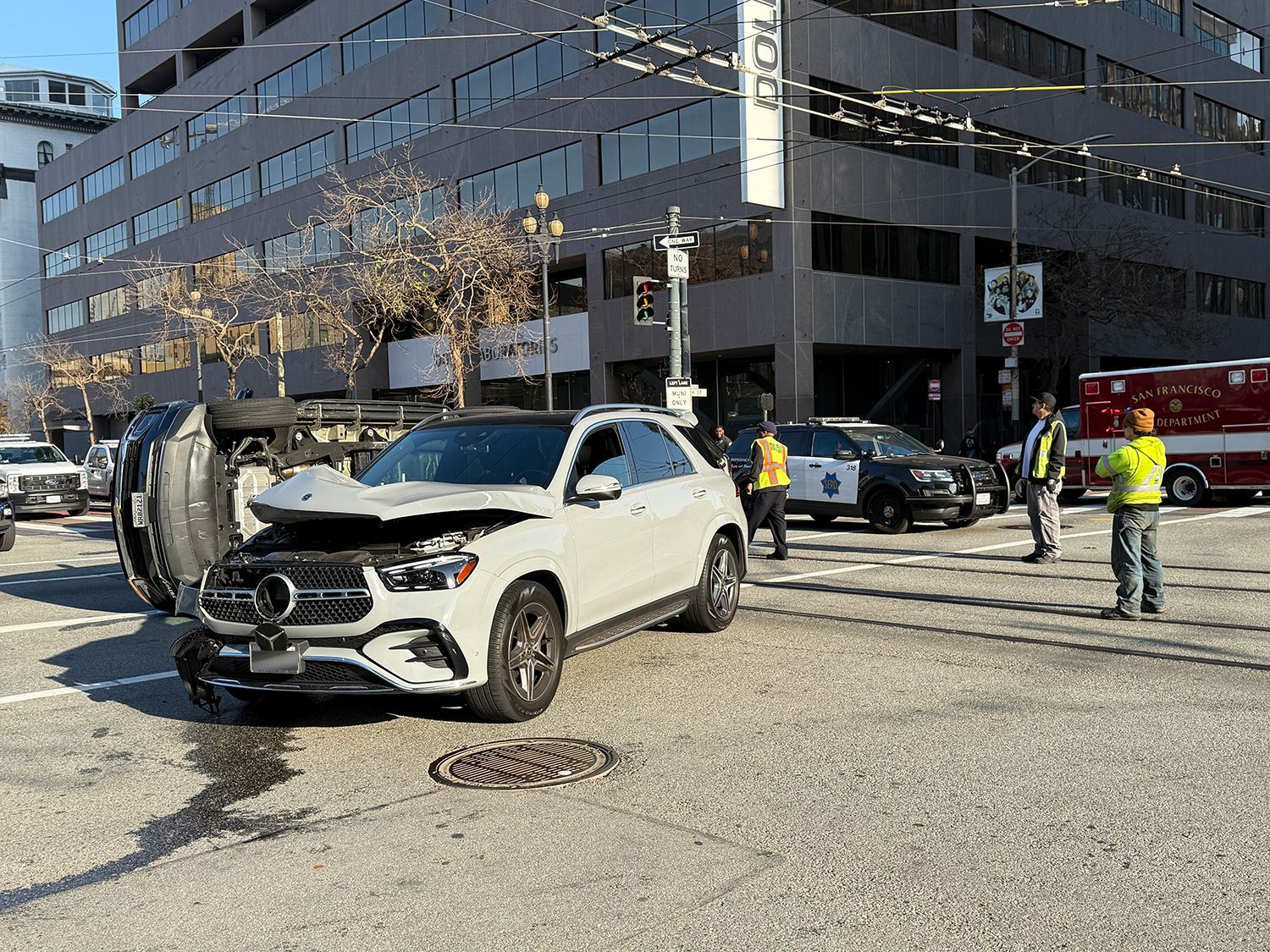 A Friday afternoon crash on Market Street at the intersection of Ninth and Larkin streets ended with a large SUV flipped on its side in the middle of the street, but reportedly injuries were minor.