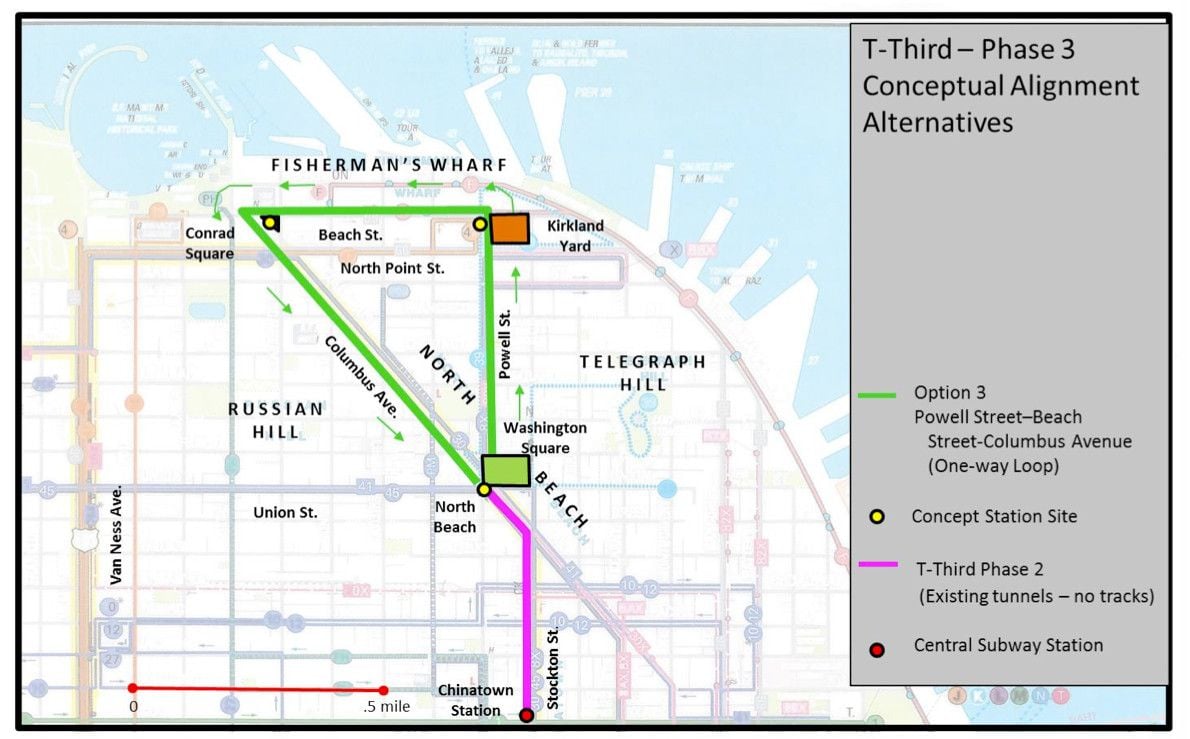 The above map shows where the extended Central Subway might go, but these drawings are more than ten years old and are from a scrapped version of the project. Regardless, they are Sauter's current working version. It takes the Central Subway line that currently goes as far as Chinatown, then adds a new station at North Beach, and then two more stations in Fisherman’s Wharf at Powell and Beach streets plus Columbus Avenue and Beach Street. That train would then head back to North Beach station.