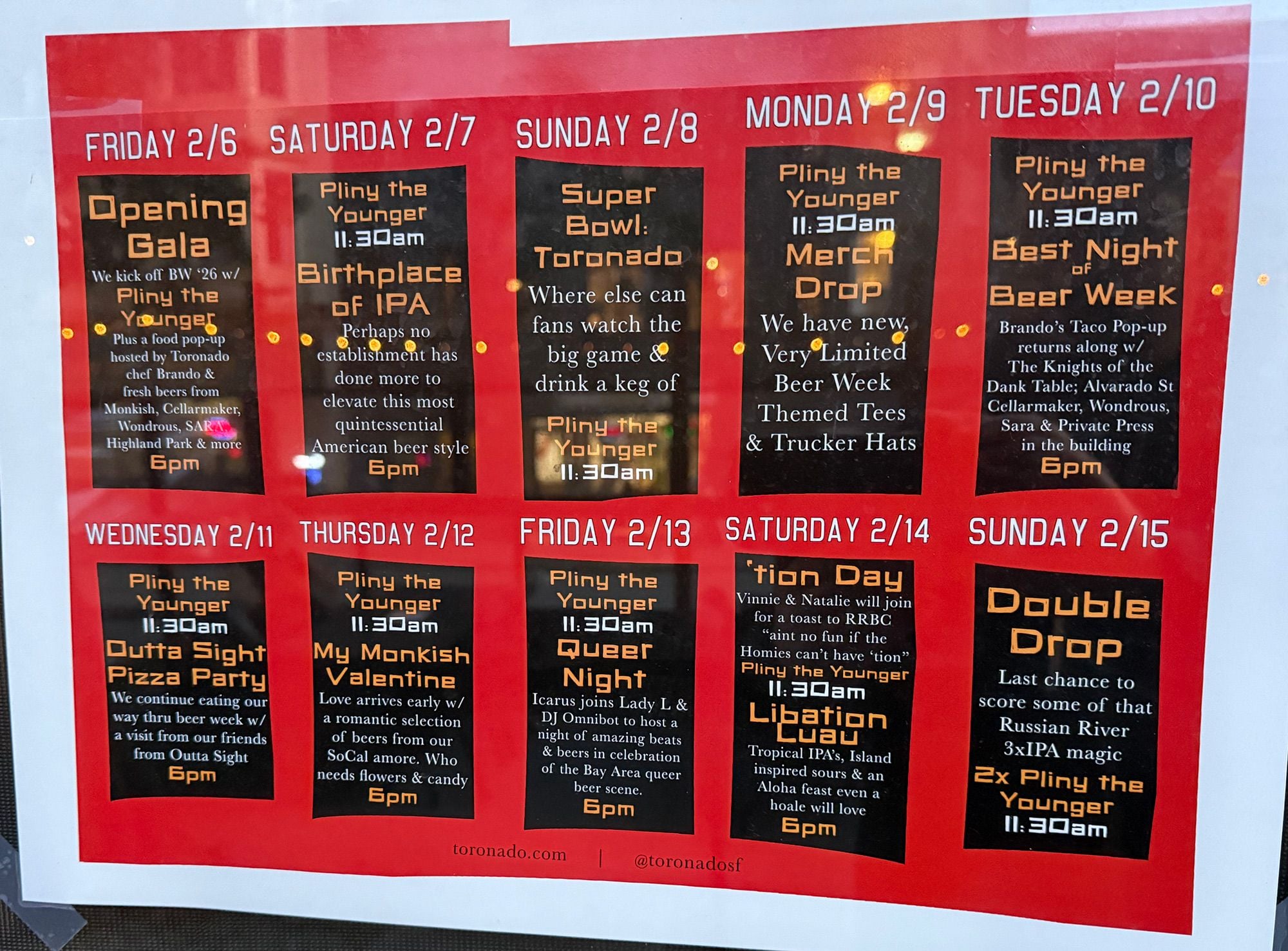 There will also be a Queer Night on February, February 13, celebrating the Bay Area's queer beer scene. And Sunday, February 15 will be the last day to get Pliny at Toronado for this year, starting at 11:30 am.