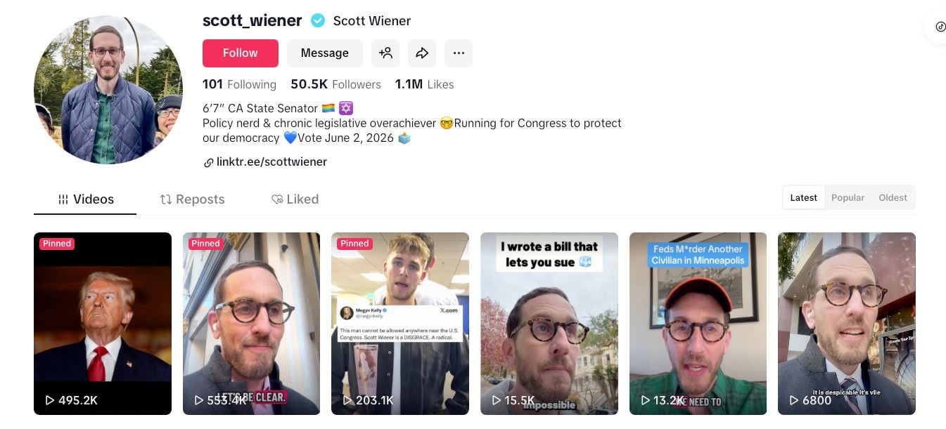 Who should wade into this mess hours later but our own state Senator Scott Wiener, who uploaded his own video critical of ICE, as KRON4 reports. “TikTok is now state-controlled media,” Wiener posted to Xitter Monday afternoon. “This morning I posted a TikTok about my legislation allowing people to sue ICE agents. It's sitting at zero views, and I'm not the only person this is happening to.”