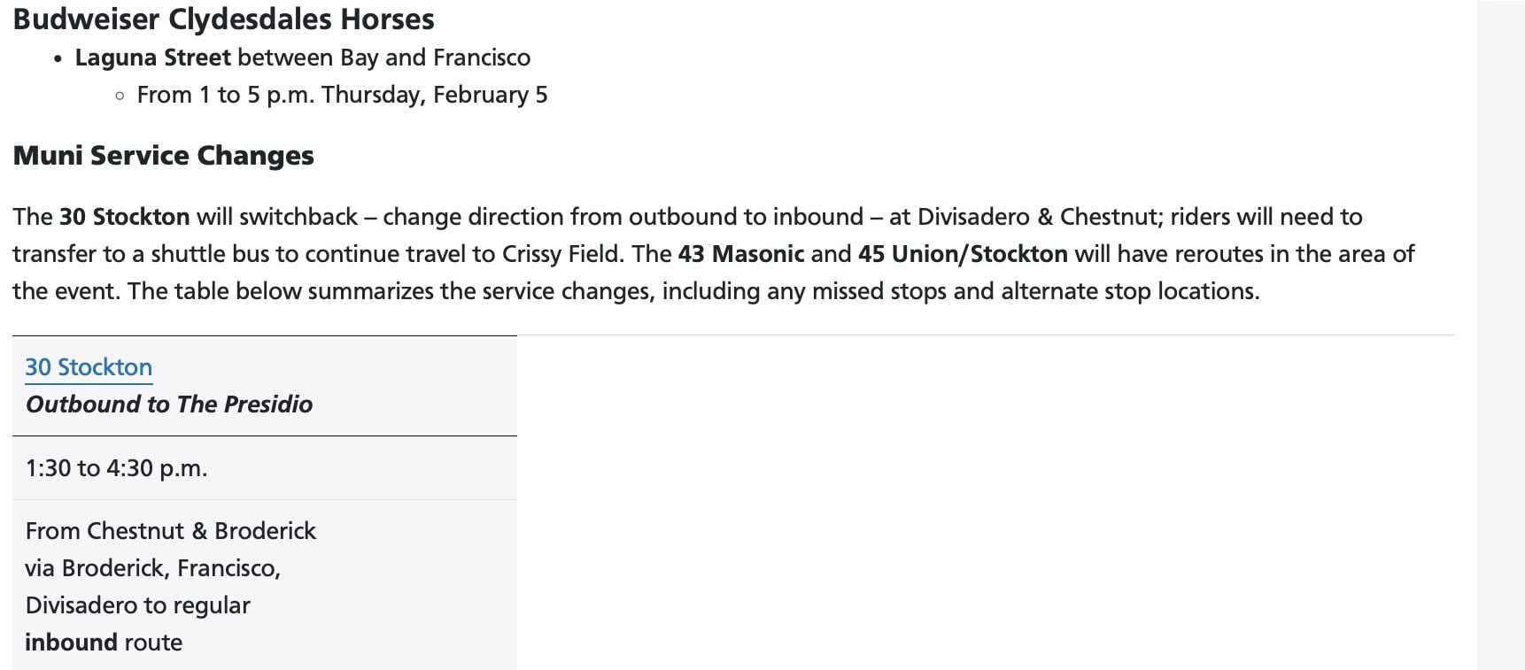 All we know for sure is what we see on the exhaustive SFMTA Super Bowl events bus reroute list seen below, which describes an event called “Budweiser Clydesdales Horses.” That listing says that the event will be at “Laguna Street between Bay and Francisco From 1 to 5 p.m. Thursday, February 5.”