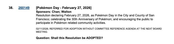 Okay, we have it as an anniversary celebration. And yes, the supervisors unanimously approved the measure to declare February 27 as Pokémon Day, for the purpose of “celebrating the 30th Anniversary of Pokémon; and encouraging the public to participate in Pokémon related community activities.”