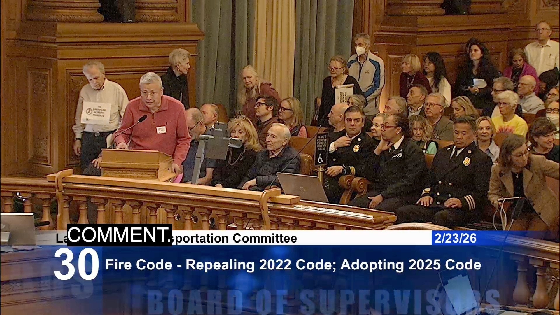 Well, that Lurie legislation came up Monday before the SF Board of Supervisors Land Use and Transportation Committee. And that committee voted unanimously to kick the can on the sprinkler requirement five years down the road from 2027 until 2032, as more than 100 homeowners lined up to complain that the fire safety rules would burden them with financial hardship.