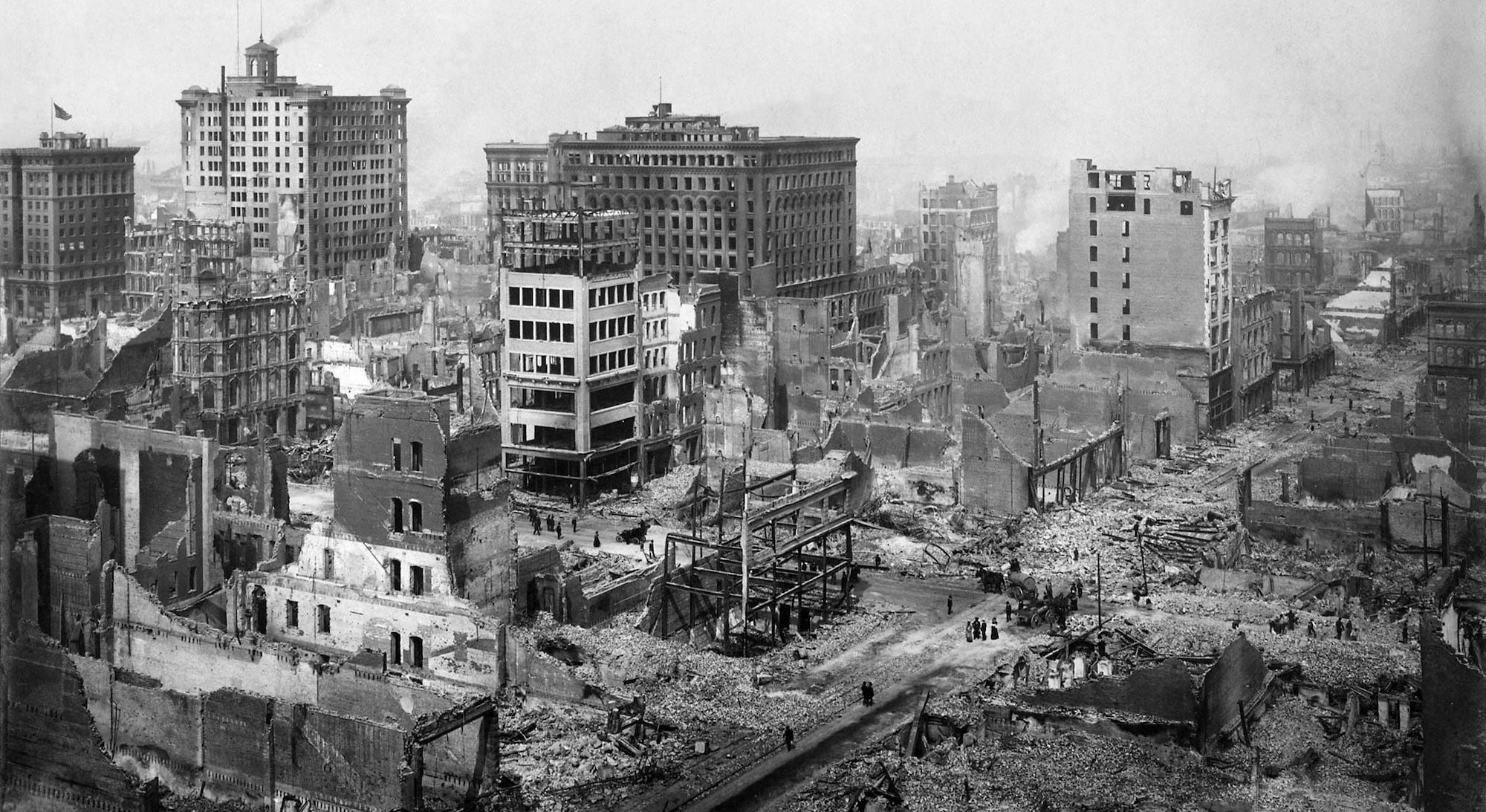 In April 1906, a 7.9 magnitude earthquake and subsequent fires killed more than 3,000 people and left roughly 250,000 homeless. Relief favored property owners, pushing working-class, poor, and minority residents — especially Chinese — to refugee camps. Indigenous people and migrants continued to face dispossession and violence, while displaced Black residents moved to East Bay neighborhoods. Women and working-class residents, including activist Mary Kelly, led direct actions to secure food, clothing, and housing, shaping early urban advocacy.