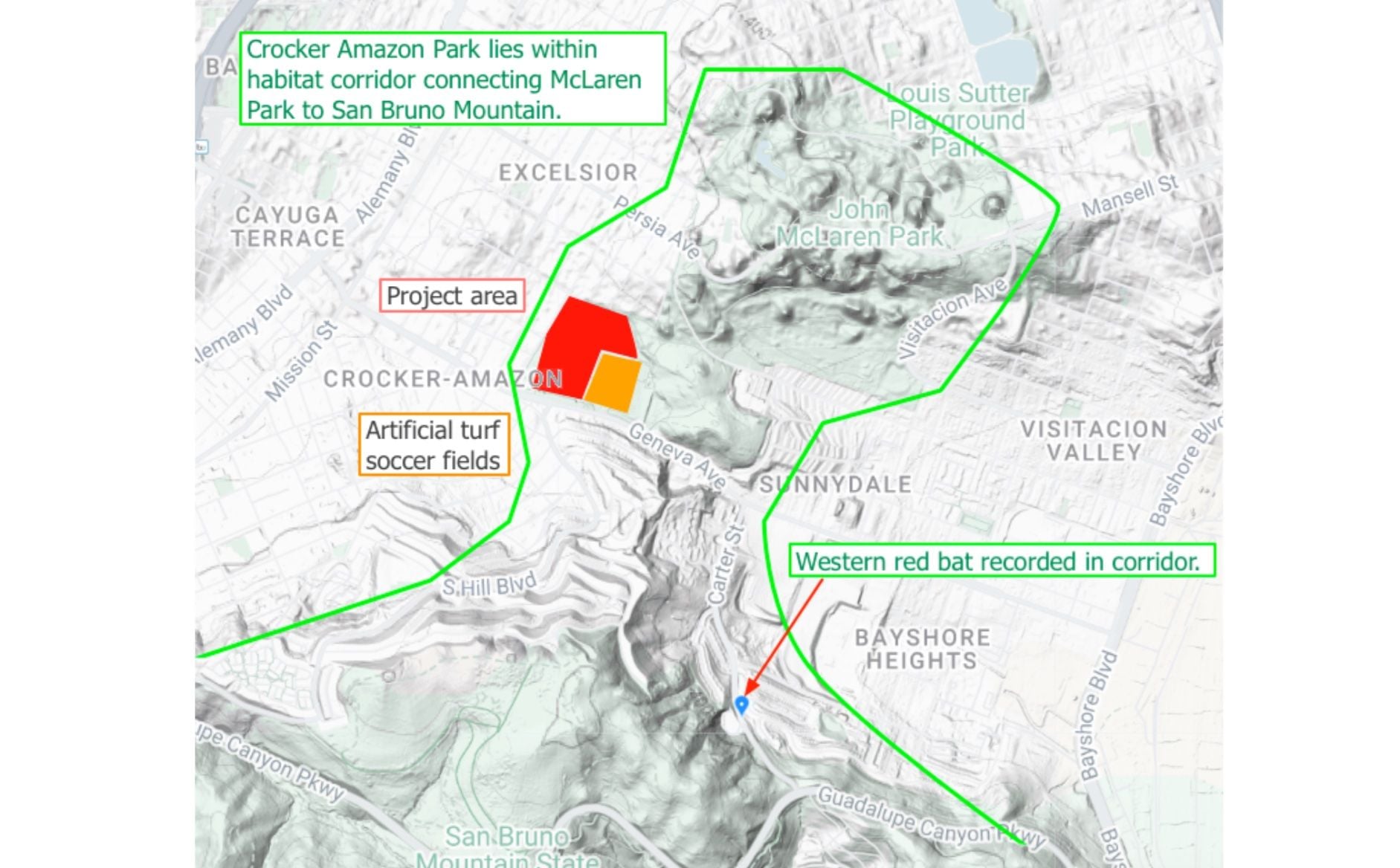 The Chronicle reports that the park, which includes the community-based Hummingbird Farm, sits at the base of McLaren Park, the city’s second-largest park at 317 acres. Keep Crocker Real emphasizes that the project site is located within a larger green corridor connecting McLaren Park to San Bruno Mountain, where natural grass with synthetic turf could have broader impacts on birds, insects, and mammals, including bats.