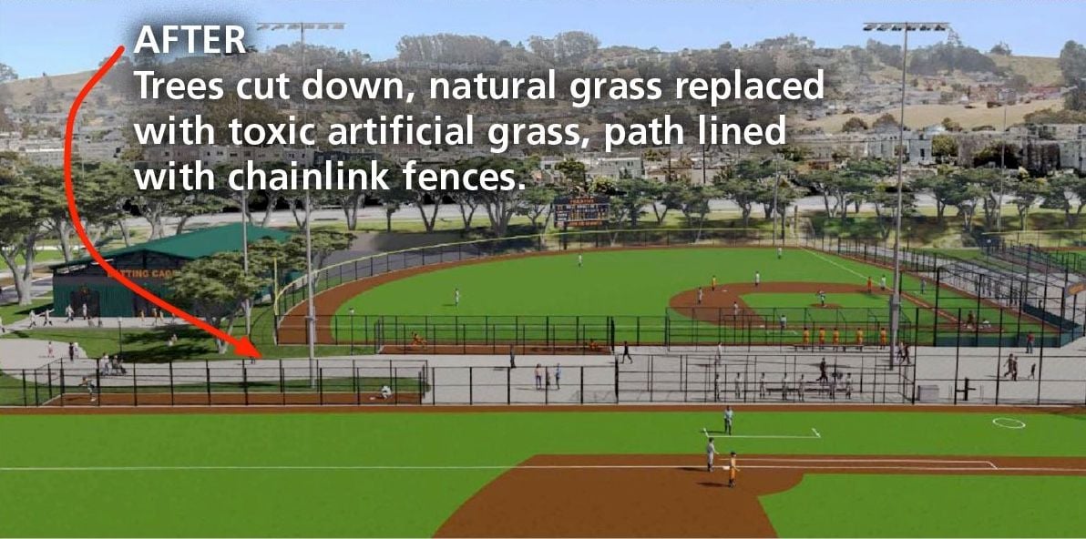 The Chronicle reports that the new 20 acres of turf would be used to create five new baseball diamonds, while leaving one natural grass field. The renovation also includes new restrooms, a dog play area, picnic tables, batting cages, and lighting for the ball fields. It also requires the removal of 128 trees along the pedestrian promenade to create infrastructure and drainage.