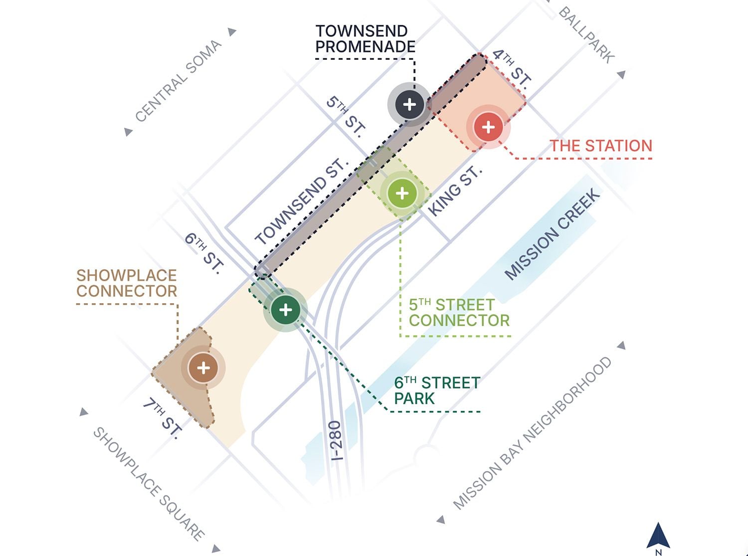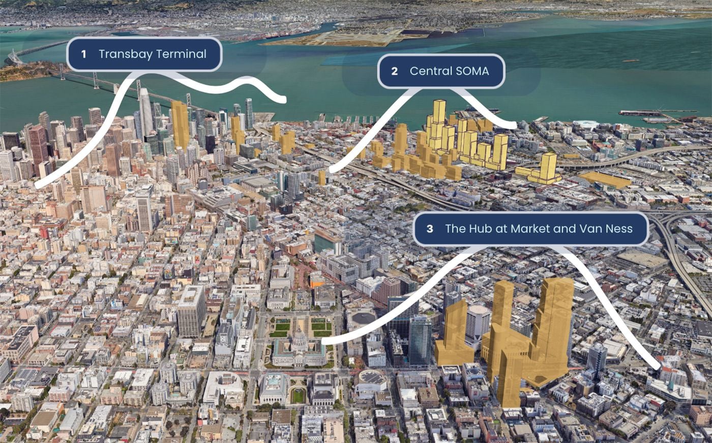 The first phase of the development would include a "world-class" transit station at 4th and King streets with an 850-square-foot tower above it, according to published plans. Several other towers stepping down in height would later join it, and the Chronicle notes that one tower of unclear height would be at 7th and King streets.