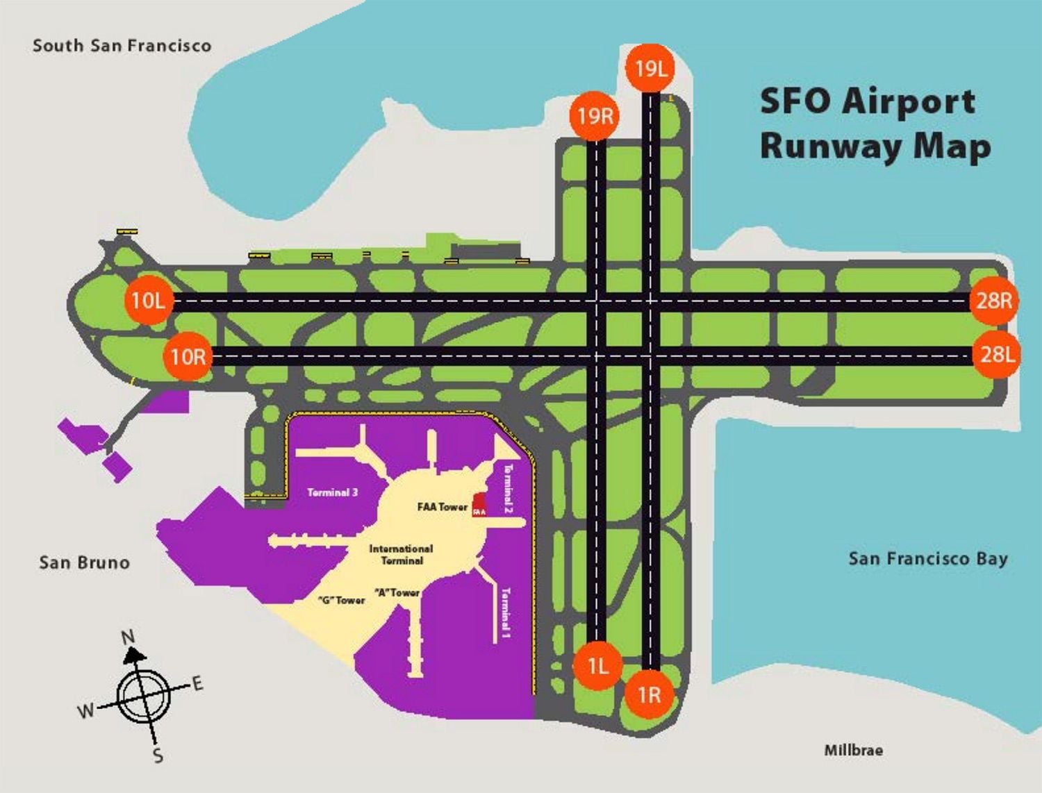 SFO has eight total departure and arrival runways on two axes, four of each, numbered by the end at which the plane begins its takeoff or landing. Runway 28R, for instance, is called 10L at the other end, if the plane were landing in the opposite direction.